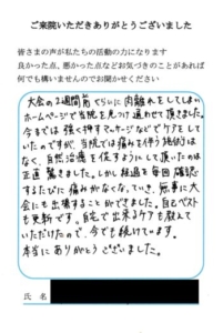 嬉しいおハガキをいただきました。 大学4年陸上部の学生さんです。 大会に向けて調整中、 本番約2週間前にハムストリングの肉離れを発症。 学生生活最後の大会がということもあり、 何としても出場したいということでご来院されま […]